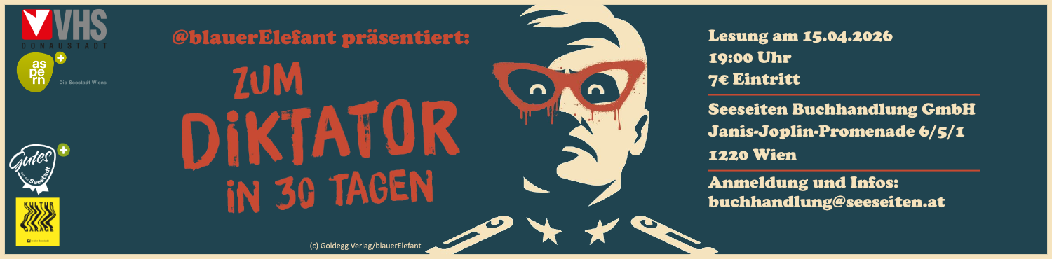 In nur einem Monat vom „kleinen Diktator“ zum politischen Überflieger … Klingt absurd? Genau darum geht es. In Zum Diktator in 30 Tagen nimmt @einblauerelefant, Facharzt für Psychiatrie und scharfsinniger Satiriker, seine Leser*innen mit auf eine gnadenlos humorvolle Reise durch die Mechanismen des Rechtspopulismus. Mit spitzer Feder seziert er die Intrigen, rhetorischen Tricks und Inszenierungen, die politische Bühnen heute dominieren.